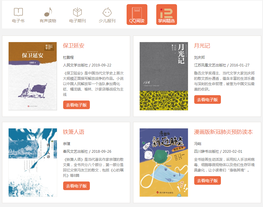 海淀区图书馆电子书资源集QQ阅读与掌阅精选两大书库为精华,包括 20万册数字图书和5万集有声图书,同时提供网站与微信公众号两种服务。