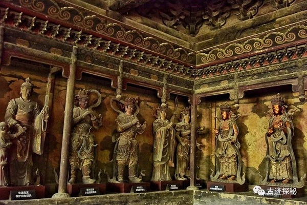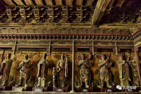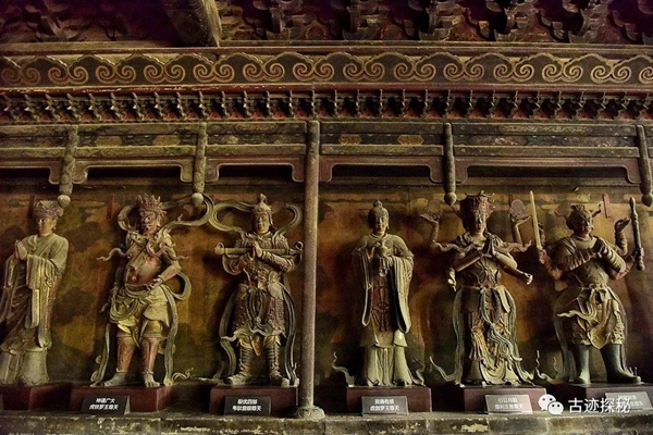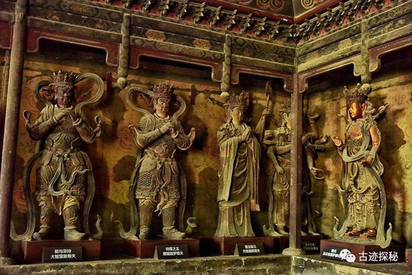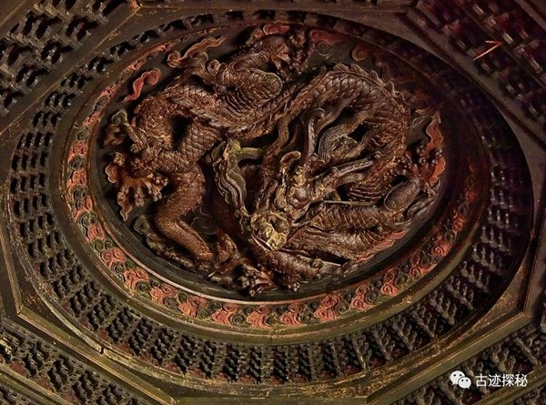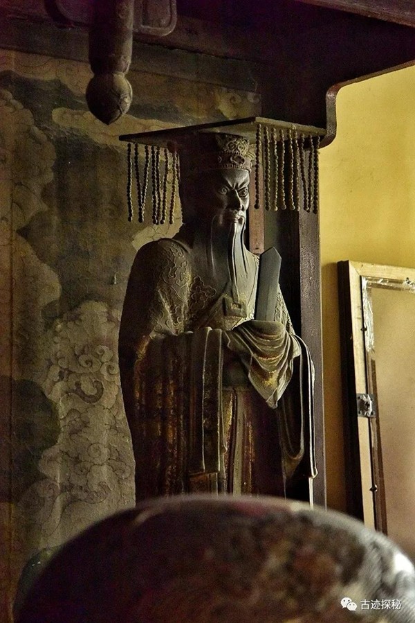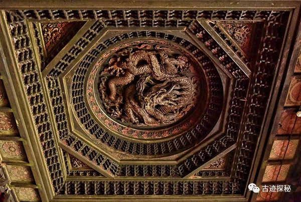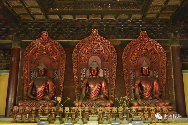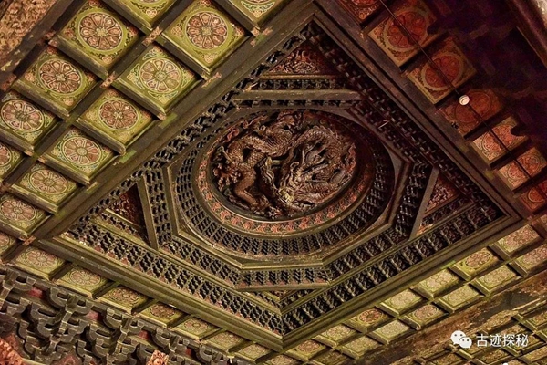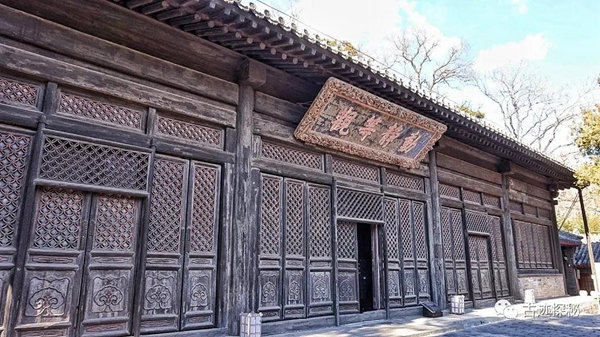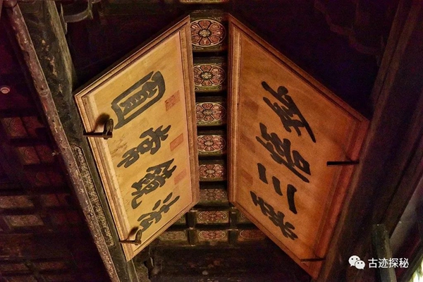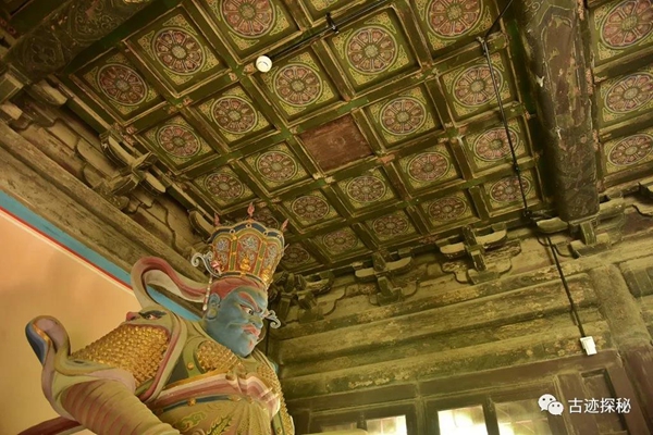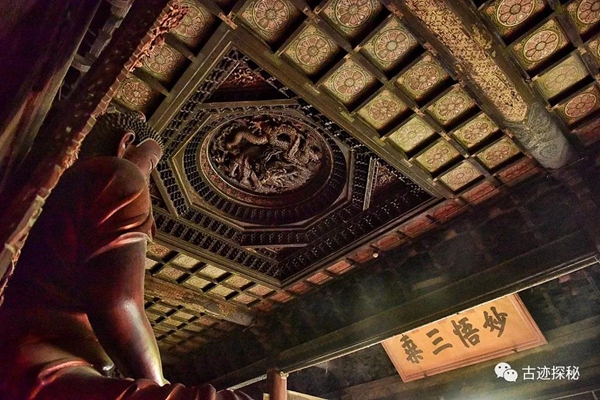 天王殿后是大雄宝殿,殿内供奉着三世佛,珍贵的是殿内天花板木制蟠龙藻井,和南北墙泥塑二十诸天像,三世佛背后还有地藏文殊、观音、普贤三大士塑像。殿门朱漆褪去,露出木质的本色,窗棂格子上的不同样式花纹,显得既古朴又素雅。
