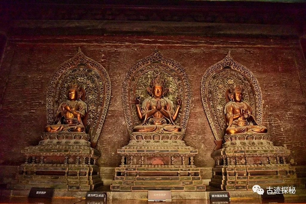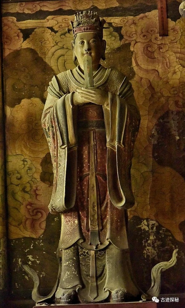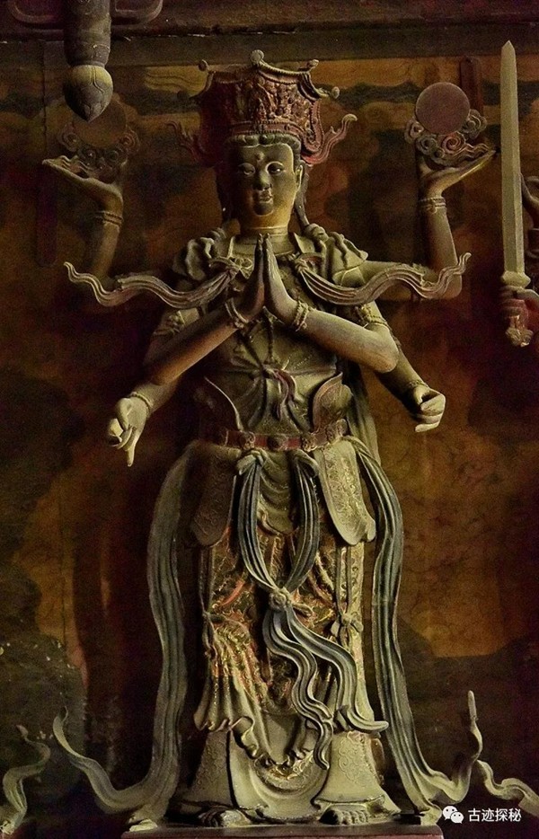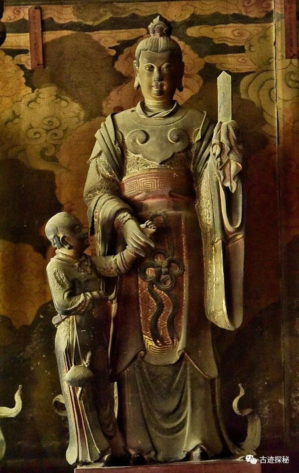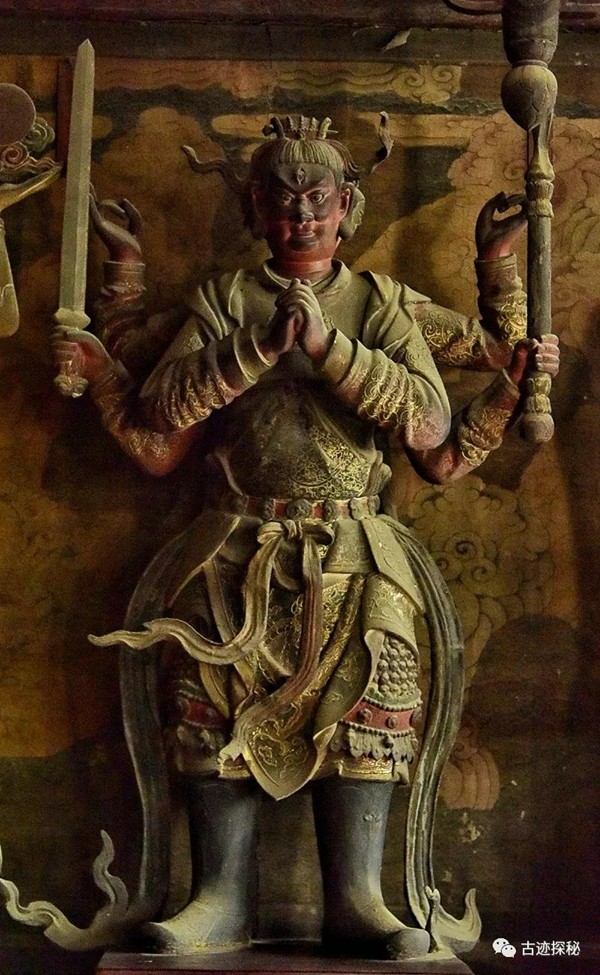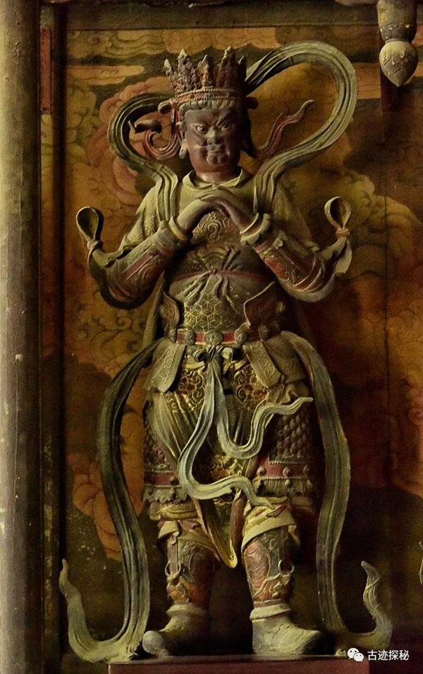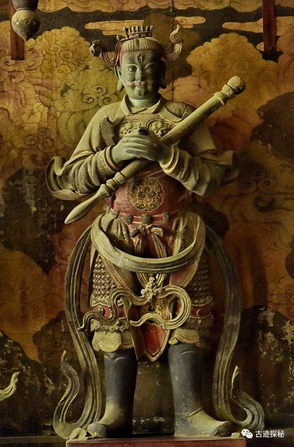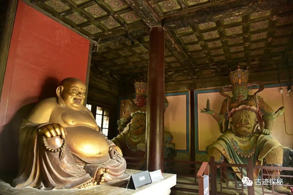 入山门第一殿是天王殿,殿前院子宽阔,左右有碑亭各一,钟鼓楼对峙,西面是放生池,天王殿内有弥勒佛和四大天王像。空旷的前院古银杏四面环护,被时间毁蚀的容颜不断被增砖添瓦,抹红刷绿。倚栏观残荷,蜻蜓眷顾的池鱼在泉水浅碧间回溯着千百年的时间。