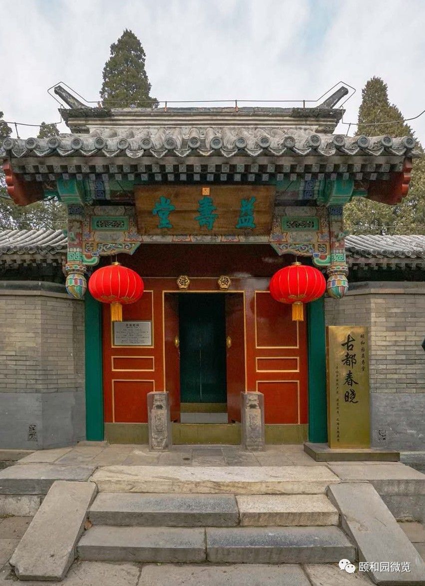 益寿堂位于颐和园万寿山东部的半山坡上,苍松翠柏之中,隐藏着一座坐北朝南的传统四合院住宅式建筑,院门是一殿一卷式的垂花门,上悬匾额“益寿堂”,进院迎面正殿为“松春斋”,由游廊将正殿及东、西配殿围合成一座完整的院落,院墙上还镶有通透精致的什锦花窗。益寿堂始建于清光绪年间,历史上曾是慈禧太后游览景福阁时用膳、更衣、休息之处。