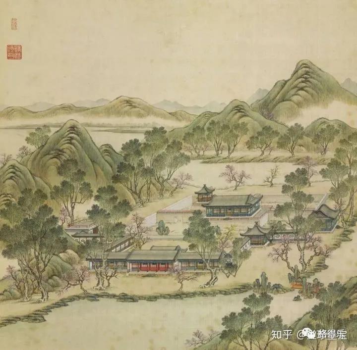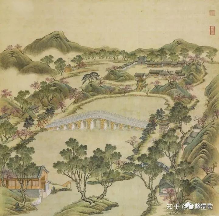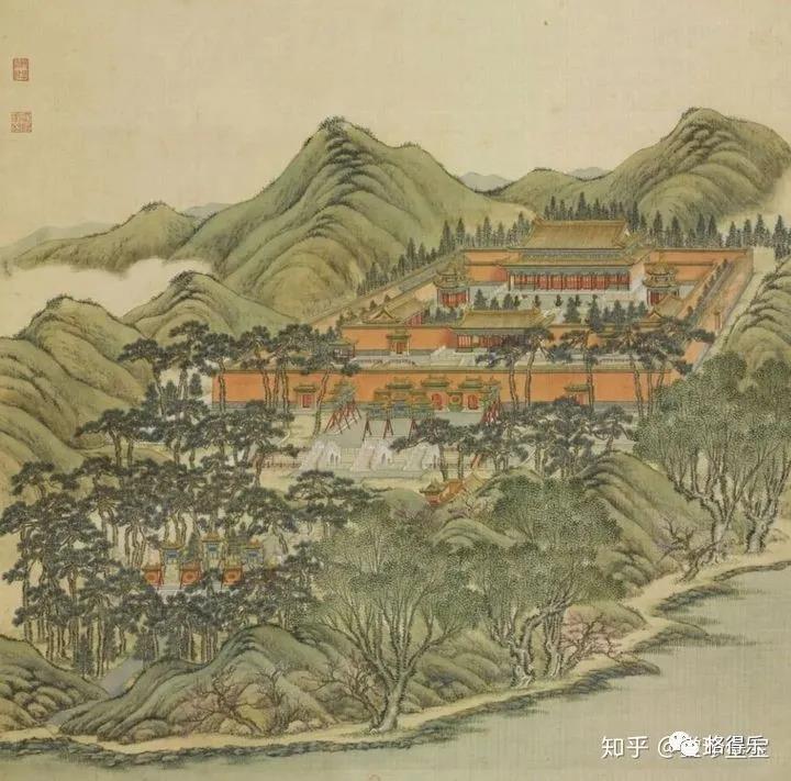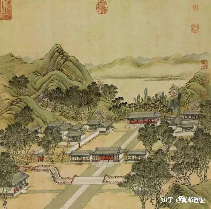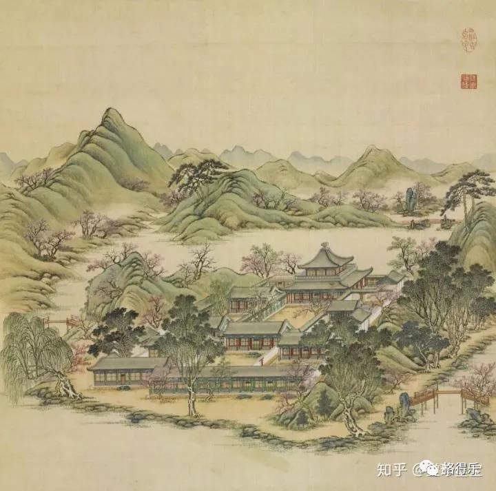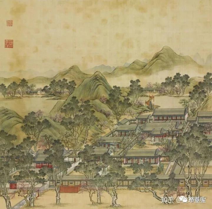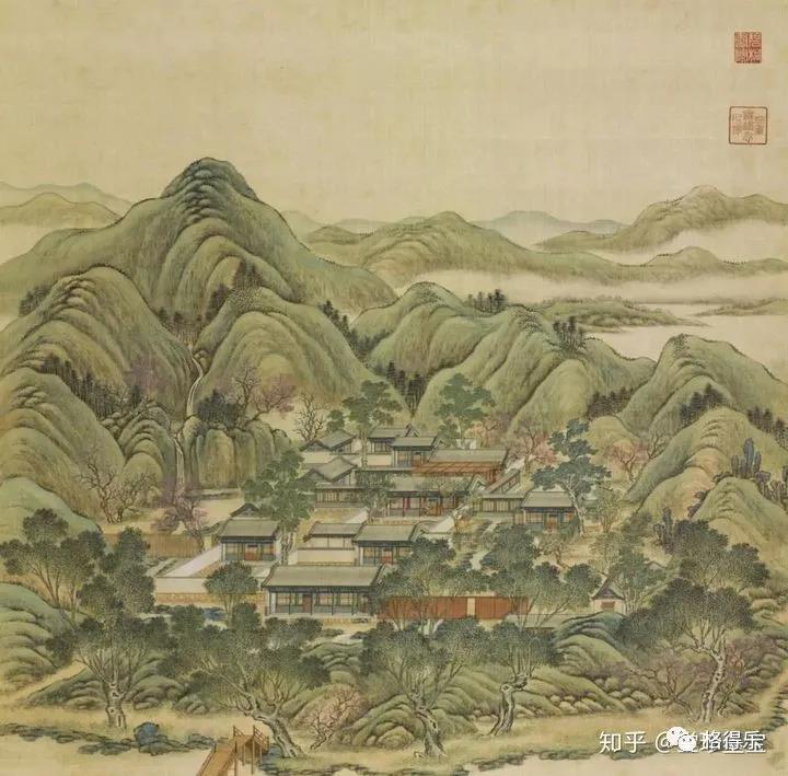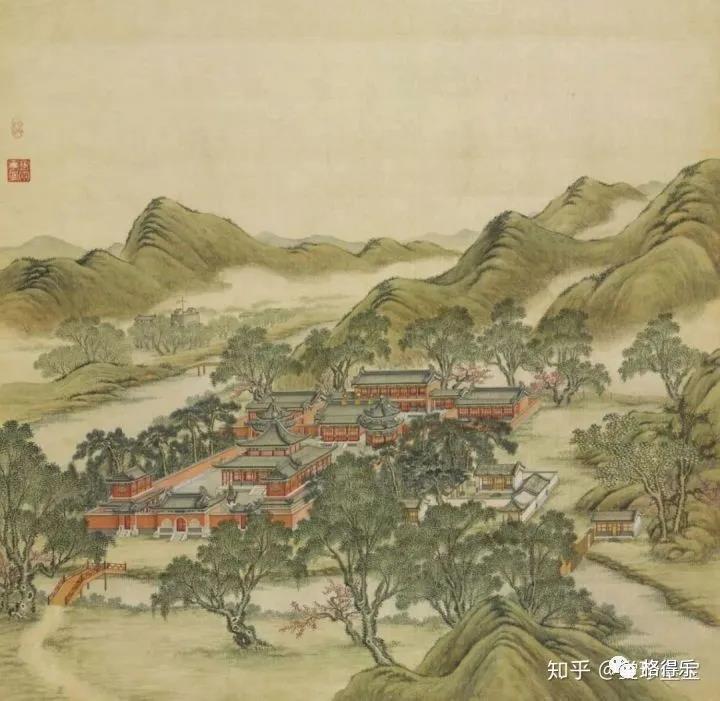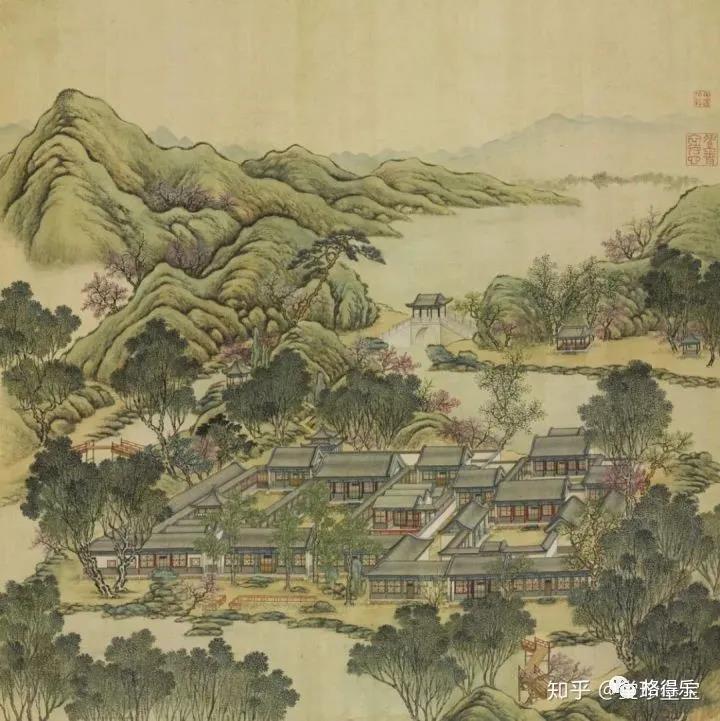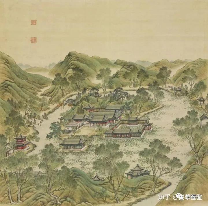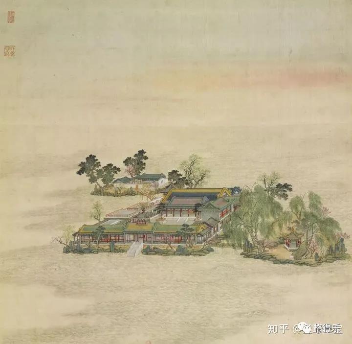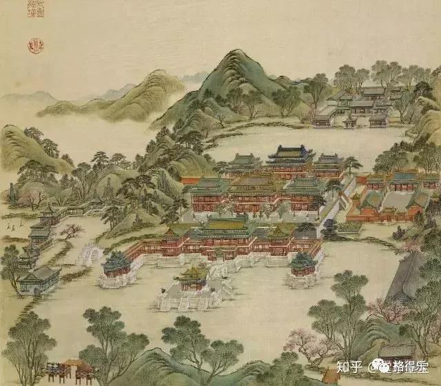 盛时的圆明园有长春园、绮春园、圆明园等一百多处园林风景群,四十景是指园内独成格局的40处景群,而每一景就是其中一座"园中园"或园林建筑群。乾隆元年(1736年)正月,弘历即传旨如意馆画师冷枚:按康熙朝绘制的避暑山庄三十六景图,为圆明园各"殿宇处所"起稿分景画样。其后不久又改令唐岱、沈源二人绘画。由沈源画房舍,唐岱画土山树石。后来周鲲等人也参与了这套"圆明园大册"的绘制。起初这套图仅绘了33景,乾隆六年增入方壶胜境、蓬岛瑶台和慈云普护3图,乾隆九年九月又增入鸿慈永祜、汇芳书院、洞天深处和月地云居4图,从而最终成为《四十景图》。《四十景图》为绢本彩绘,各幅图分别附有汪由敦所书弘历《四十景题诗》,共计40对幅,每对幅为右图左诗。每幅图的绢心64×65厘米,连装池绫边为83×75厘米。全图分为上下两册,配楠木插盖匣盛装。首册画页之前分裱雍正书《圆明园记》和乾隆书《圆明园后记》。在上下册各最后一景的图、诗末尾,分别款书"乾隆九年甲子九月奉敕,臣唐岱、沈源恭画"和"工部尚书臣汪由敦奉敕敬书"字样。这套四十景彩绘图,直至乾隆十一年四月,才最终裱成呈进,又经装配木匣之后,在十二年(1747年)六月,奉旨正式安设于圆明园奉三无私殿呈览。