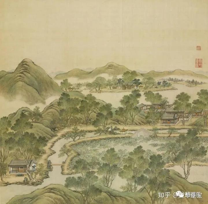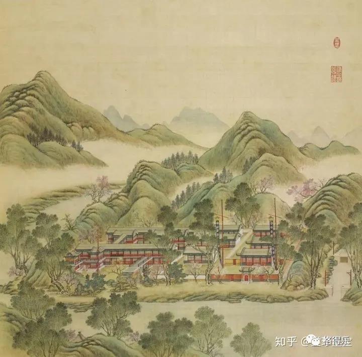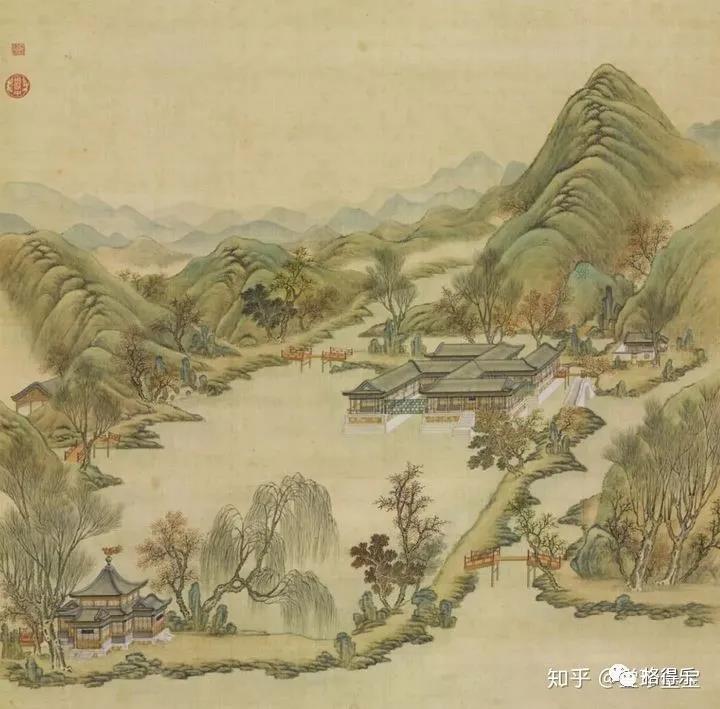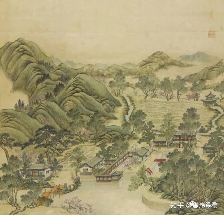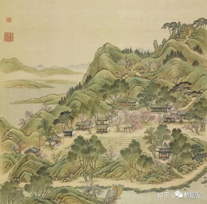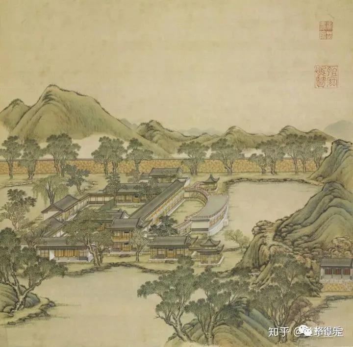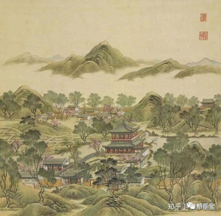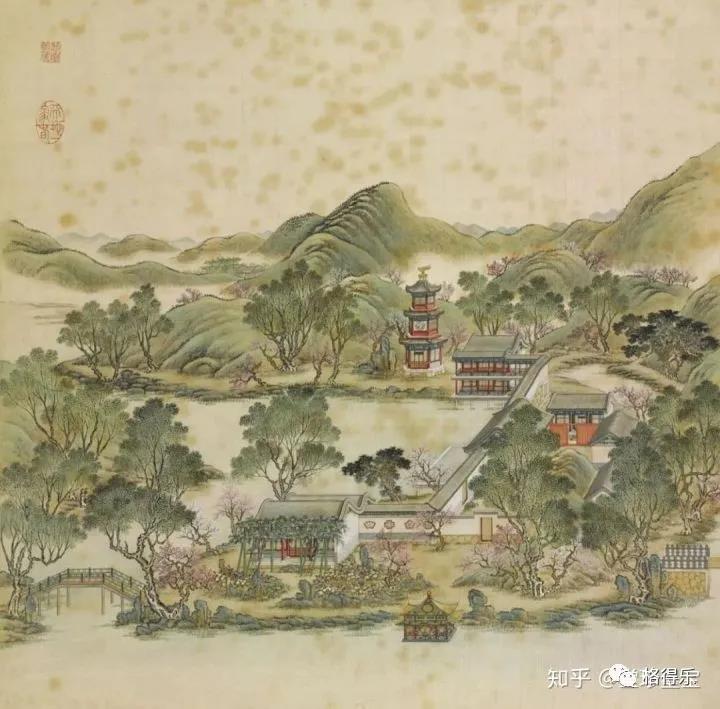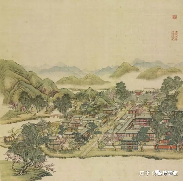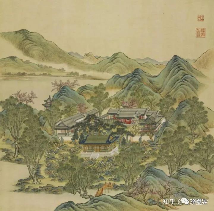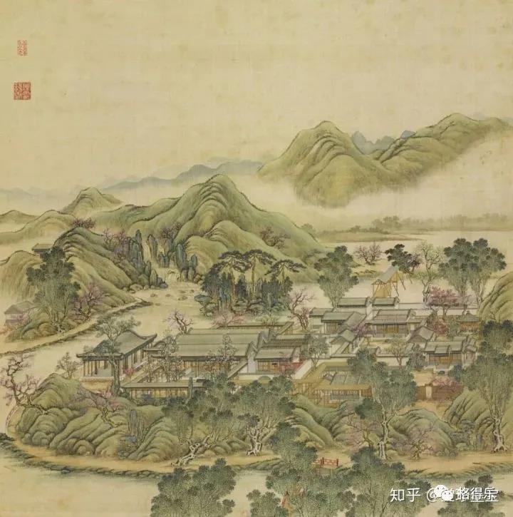 盛时的圆明园有长春园、绮春园、圆明园等一百多处园林风景群,四十景是指园内独成格局的40处景群,而每一景就是其中一座"园中园"或园林建筑群。乾隆元年(1736年)正月,弘历即传旨如意馆画师冷枚:按康熙朝绘制的避暑山庄三十六景图,为圆明园各"殿宇处所"起稿分景画样。其后不久又改令唐岱、沈源二人绘画。由沈源画房舍,唐岱画土山树石。后来周鲲等人也参与了这套"圆明园大册"的绘制。起初这套图仅绘了33景,乾隆六年增入方壶胜境、蓬岛瑶台和慈云普护3图,乾隆九年九月又增入鸿慈永祜、汇芳书院、洞天深处和月地云居4图,从而最终成为《四十景图》。《四十景图》为绢本彩绘,各幅图分别附有汪由敦所书弘历《四十景题诗》,共计40对幅,每对幅为右图左诗。每幅图的绢心64×65厘米,连装池绫边为83×75厘米。全图分为上下两册,配楠木插盖匣盛装。首册画页之前分裱雍正书《圆明园记》和乾隆书《圆明园后记》。在上下册各最后一景的图、诗末尾,分别款书"乾隆九年甲子九月奉敕,臣唐岱、沈源恭画"和"工部尚书臣汪由敦奉敕敬书"字样。这套四十景彩绘图,直至乾隆十一年四月,才最终裱成呈进,又经装配木匣之后,在十二年(1747年)六月,奉旨正式安设于圆明园奉三无私殿呈览。